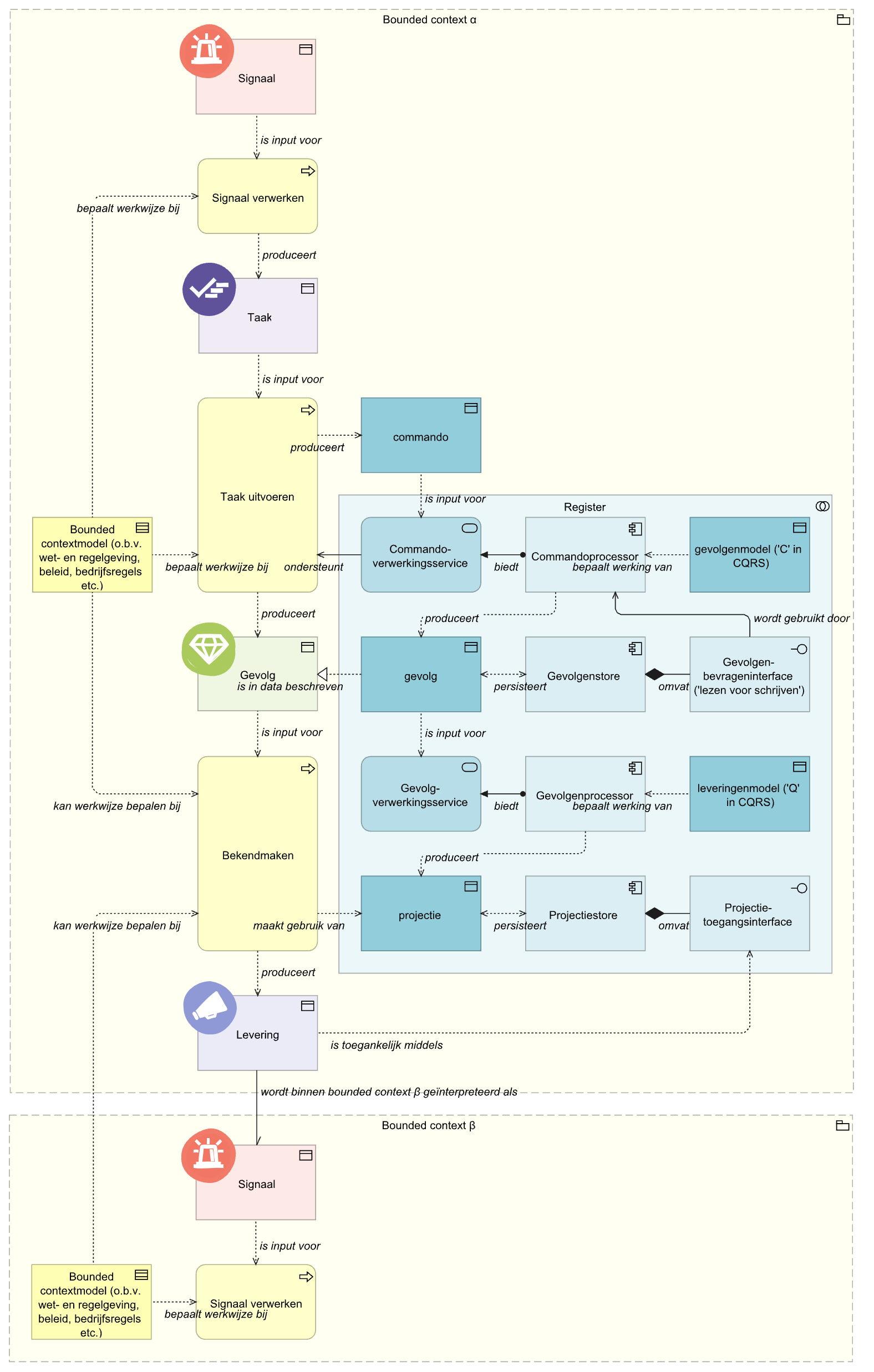 Het verwerken van signalen kan uiteraard ook applicatief ondersteund en eventueel geautomatiseerd worden. Dit geldt zeker als een signaal in de vorm van een notificatie wordt ontvangen. Omdat zo'n notificatie (ten opzichte van het register) veelal van buiten de 'eigen' bounded context afkomstig is, en vanuit het register dus geen controle bestaat over de vorm en inhoud daarvan, beschouwen we de elementen in de applicatiearchitectuur die hiervoor nodig zijn niet als onderdeel van het register. Deze elementen zijn daarom hierboven niet geïllustreerd. Wel verdient dit expliciete aandacht, zoals ook beschreven bij contextovergangen.